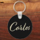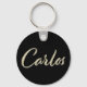 Ein sehr schöner edler personalisierter Button Schlüsselanhänger im whitegold Lettering Look auf schwarz für Carlos.