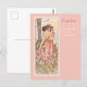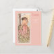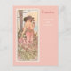 A fine art postcard with the vintage illustration by Alphonse Mucha from The Flower Series, Carnation (1898), which has been digitally restored and enhanced. A portrait of a woman in a pink gown surrounded by a field of pink and white carnations.