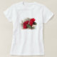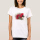 This stunning spaghetti strap t-shirt features two brilliant red carnations set on a pearly white embossed brocade fabric background.