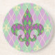 A harlequin pattern of green and purple is transformed into a playful argyle with an overlay of gold diamond outlines and fleur de lis, creating a fun and colourful pattern perfect for any New Orleans influenced Mardi Gras celebration. The pattern is masked behind the silhouette of a fleur de lis to add a fun final note.
