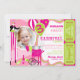 Carnival birthday invite template with photo insert in pinks and lime green. Features a juggling stilt walker, cotton candy machine, balloons, and raffle tickets at side. Just perforate the sides for an easy tear off!
