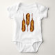 Baby suit features an original illustration of a row of corn dogs with a squiggle of mustard on top.