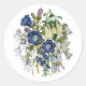 Old-fashioned botanical illustration of bellflowers in blue, purple and white.