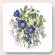 Old-fashioned botanical illustration of bellflowers in blue, purple and white.