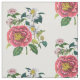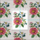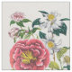 Old-fashioned botanical illustration of camellias in pink, red and white.