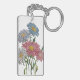 Old-fashioned botanical illustration of China asters in pink, white and blue.