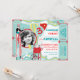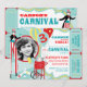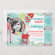 Stilt walkers, cotton candy, and balloons carnival theme birthday card with photo insert in blues, red, white, and yellow with raffle tickets at side. Just perforate the sides for an easy tear off!