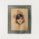 This is a head shot portrait of Carole Lombard in a classic look of the 1930's wearing a black cap hat with a hairnet accent which accentuates her golden hair and captivating blue/green eyes.