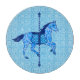 Mixed media digital graphic of a classic carousel horse, in mixed patterns, against an arabesque tiled background - Dark cobalt blue, shades of sky blue, and white