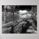 A dramatic black and white landscape of long tree shadows and white fluffy clouds has two birds of prey flying in the distance.