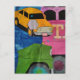 A mixed media collage by the artist Angelandspot and photographed by Angelandspot with vintage children's book pages that I randomly used in a bright colored collage and then used pastels, highlighters, and paints on to make random marks. A yellow car, a street sign, a green truck, and a pink truck on a blue background