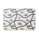 Kid's car-themed bathroom mat with roads and different vehicle illustrations. Ideal home decor for a truck or roads-obsessed kid's bedroom.