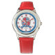 Letter C Carter boys name meaning heraldry knights shield kids wrist watch. Knights style shield monogram letter C art name simple numbered clock face in shades of red, blue white and grey. Personalise with your own name and name meaning for a great unique personalised gift, this example is for names with the letter C and currently reads Carter The transporter. Other matching items and names available. Unique shield bird, crown, star and letter C graphic art, name research, wording and design by Sarah Trett. www.sarahtrett.com for www.mylittleeden.com