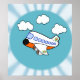 Adorable cartoon aeroplane flying through the blue skies and clouds. On a sunburst background in blue