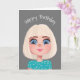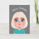 Cute cartoon girl with blonde bobbed hair on a grey background with Happy Birthday text.