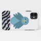 A cute blue bird with a cute expression and pink feet. A zebra print border accents it.