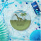 Destei's original cartoon illustration of a cute green colour Brachiosaurus dinosaur standing in a tropical world including a palm tree, some plants and green grass. The sky is blue with some clouds on it. There are also two personalizable text areas.