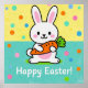 Cartoon bunny holding a carrot, surrounded by polka dots and Happy Easter!