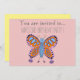 A cute fully customisable birthday invitation suitable for a young child, infant, baby or toddler. This cute design is for a boy's or girl's party and has a picture of a cartoon colourful butterfly and the background colour is customisable.