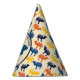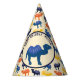 Celebrate birthdays and other special events in style with these paper party hats featuring a cartoon style illustration of a bactrian camel or a camel with two humps in medium blue against a desert sand coloured background with your own personalised message and an all over pattern of camels in shades of blue, orange and yellow.
