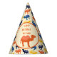 Celebrate birthdays and other special events in style with these paper party hats featuring a cartoon style illustration of a bactrian camel or a camel with two humps in orange against a desert sand coloured background with your own personalised message and an all over pattern of camels in shades of blue, orange and yellow.