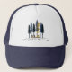 Need a little mental escape to decompress from the daily grind? Why not go off-the-grid and head out into the woods and sleep under the stars. This whimsical cartoon camping trucker hat features a pup tent pitched under tall pine trees in front of a cosy campfire with swirling wisps of smoke.