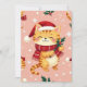 Seamless pattern of cartoon cat with red hats and scarves, sleeping and jumping, with mistletoe and snowflakes on a pink background