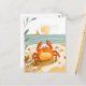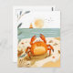 A playful crab on the beach with a boat in the background, enjoying the sunny coastal scene.