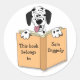 This bookplate template is a round vinyl sticker with a cartoon Dalmatian dog behind an open book. It says, "This book belongs to Sam Diggedy."