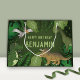 Destei's original cute cartoon illustration of different kind of dinosaurs together with some green jungle plant foliage. The dinosaurs included are Tyrannosaurus / T-rex, Triceratops, Pteranodon and Brachiosaurus. The background colour is green. There are also two personalizable text areas.