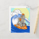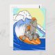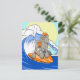 A funny cartoon illustration of a poodle on a surfboard. This surfing dog illustration has the poodle under a big wave on a orange surfboard. In the background is a volcano, giving this to look of a Hawaiian surf break. A cute design for kids or anyone who loves dogs.