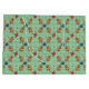 A cute cartoon style red dachshund with a friendly expression stands against a background of green with a blue paw print centred between four copies of the dog image. The background is scatted with more paw prints and toy bones. This pattern is tiled so that it will easily transfer to other product types.