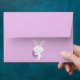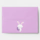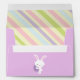 A sweet easter design envelope to coordinate with matching Easter greeting cards or invitations, featuring a cute cartoon easter bunny holding an easter egg in its arms the back of the envelope. The inside of the envelope has a striped background of lovely spring pastel colours.