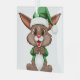A cartoon rabbit with white fur, large ears, and a cheerful expression.  It is wearing a green Christmas themed