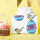 An illustration of a cute cartoon great tit bird on a blue stripes colour Easter egg with pink ribbon and violet flowers. This design is a gift idea for easter egg hunting lovers, spring season lovers and chickadee or cinciallegra bird lovers.