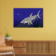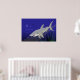 A cute cartoon illustration of a Great White Shark exploring the depths of the ocean is on this art poster for kids and adults who love sharks.