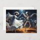 A digital illustration of ghosts and skeletons swing dancing at a party on Halloween.
