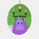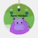 A fun design featuring a cartoon hippo with snowflakes and Christmas decorations above him. A green shaded background.