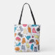 This fun tote bag has an all-over design of cartoon cats in various colours on a white background. Some cats are sleeping, some are playing, some are eating, some are wearing ties and glasses.