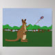 A cute and whimsical cartoon illustration of a mother kangaroo flying a kite in a green field of trees for her baby kangaroo, who is happily sitting in the pouch watching. Created with construction paper and manipulated in Photoshop by KLeighE of Hinterland Harmony’s Whimsical Cartoon Art ™