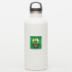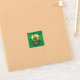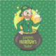 Vinyl Sticker with an Illustration of a smiling leprechaun wearing a green suit, a bow-tie, and a bowler hat while sitting inside a pot o’ gold and holding a pint of beer, with yellow, green, and orange rainbow in the background. The image is placed over a seamless dark green background with shamrocks.
