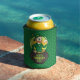 Can Cooler with an Illustration of a smiling leprechaun wearing a green suit, a bow-tie, and a bowler hat while sitting inside a pot o’ gold and holding a pint of beer, with yellow, green, and orange rainbow in the background. The image is placed over a seamless dark green background with shamrocks.