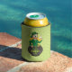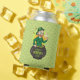 Can Cooler with an Illustration of a smiling leprechaun wearing a green suit, a bow-tie, and a bowler hat while sitting inside a pot o’ gold and holding a pint of beer, with yellow, green, and orange rainbow in the background. The image is placed over a seamless light green background with shamrocks.