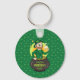 Keychain with an Illustration of a smiling leprechaun wearing a green suit, a bow-tie, and a bowler hat while sitting inside a pot o’ gold and holding a pint of beer, with yellow, green, and orange rainbow in the background. The image is placed over a seamless dark green background with shamrocks.