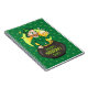 Notebook with an Illustration of a smiling leprechaun wearing a green suit, a bow-tie, and a bowler hat while sitting inside a pot o’ gold and holding a pint of beer, with yellow, green, and orange rainbow in the background. The image is placed over a seamless dark green background with shamrocks.