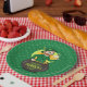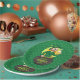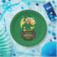 Paper Plate with an Illustration of a smiling leprechaun wearing a green suit, a bow-tie, and a bowler hat while sitting inside a pot o’ gold and holding a pint of beer, with yellow, green, and orange rainbow in the background. The image is placed over a seamless dark green background with shamrocks.