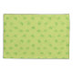 Pillow case with an Illustration of a smiling leprechaun wearing a green suit, a bow-tie, and a bowler hat while sitting inside a pot o’ gold and holding a pint of beer, with yellow, green, and orange rainbow in the background. The image is placed over a seamless light green background with shamrocks.