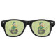 Party Sunglasses with an Illustration of a smiling leprechaun wearing a green suit, a bow-tie, and a bowler hat while sitting inside a pot o’ gold and holding a pint of beer, with yellow, green, and orange rainbow in the background. The image is placed over a seamless light green background with shamrocks.