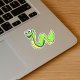 This vinyl sticker is a cartoon snake who is neon green and light yellow with big white eyes and smiling.