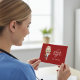 Cartoon nurse dressed in her white uniform with bouquet of red flowers on left, "Thank You So Much!" typography on front, and template text inside card. Red background.